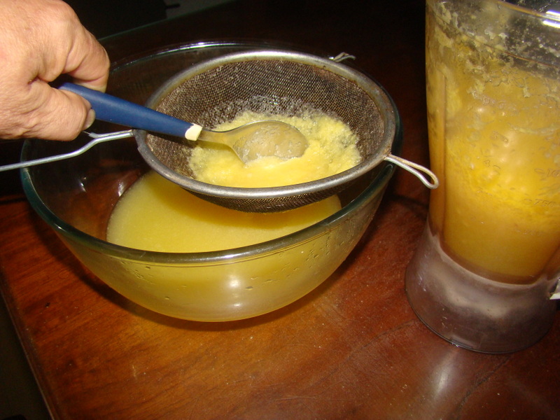 Colar y recuperar todo el líquido, esta operación es optativa, si no lo colamos quedará un color más turbio, a mi me gusta colar porque da una mejor presentación y elimina los restos de fibra de las frutas que podrían dar un leve amargor: