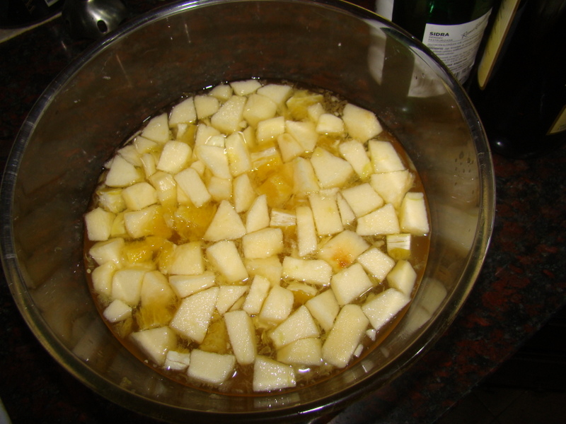 Poner a macerar unos 30 min a 1 hora las frutas en el alcohol (vino, sidra y ginebra) con el jugo del limón en la heladera: